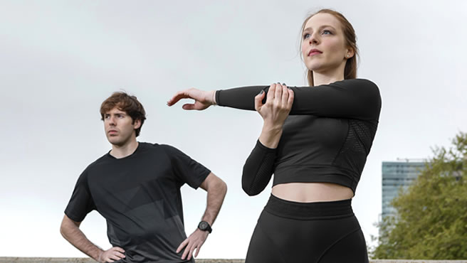 請著彈性運動服。
